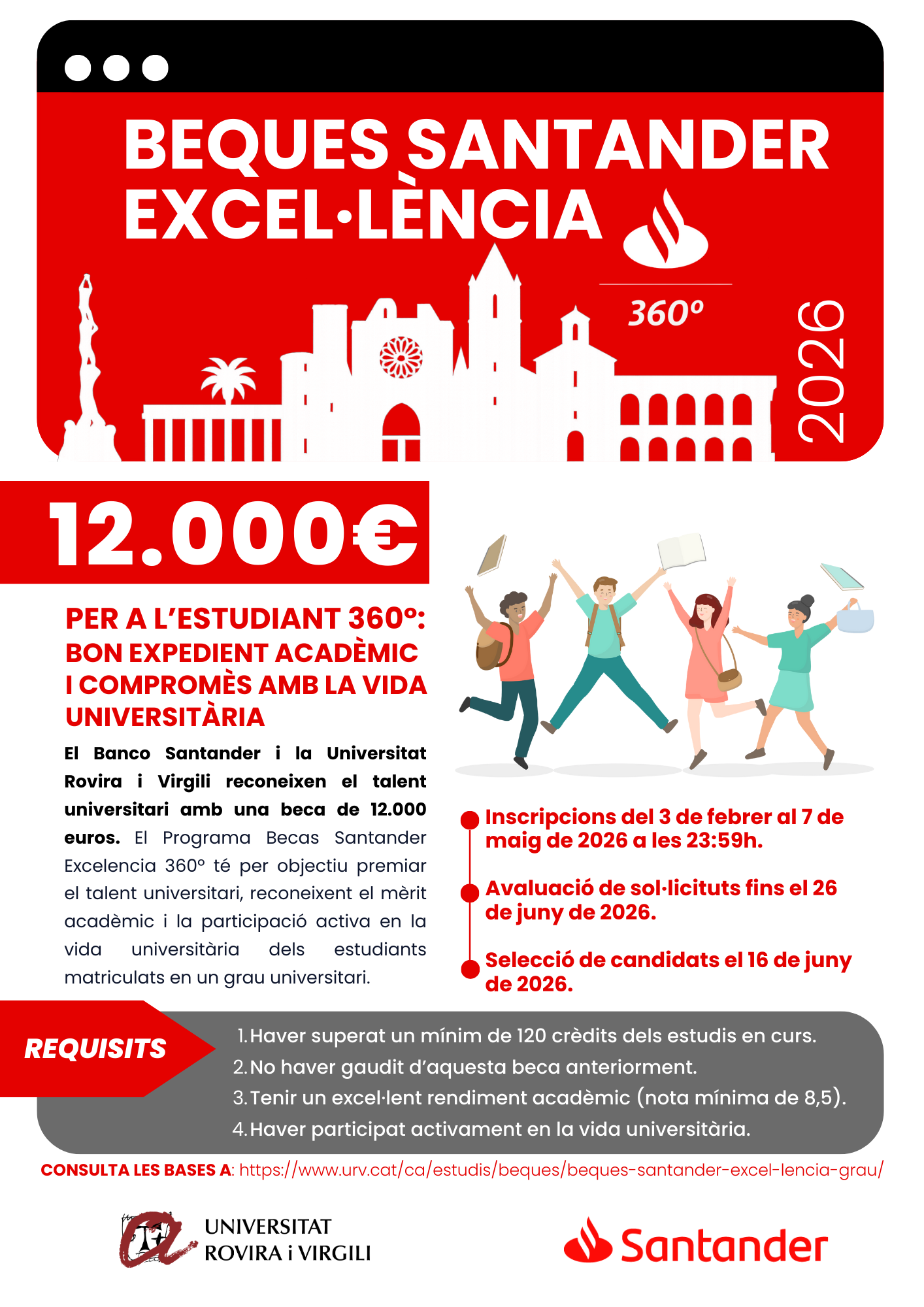 El Programa Beques Santander Excel·lència 360º té com a objectiu premiar el talent universitari, reconeixent el mèrit acadèmic i la participació activa a la vida universitària dels estudiants matriculats en un grau de les universitats espanyoles participants.