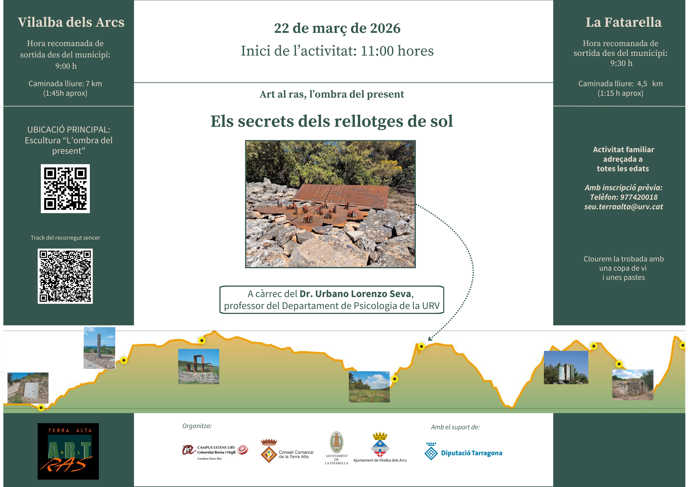 La part de la caminada és lliure. Sortida organitzada per al seu del Campus Extens de la URV junt amb els Ajuntaments de la Fatarella i Vilalba dels Arcs, i el Consell Comarcal de la Terra Alta. Les persones participants sortiran caminant des dels dos municipis fins a l'escultura "Art al Ras, l'ombra del present" i durant el recorregut podran observar diferents escultures del projecte Art al Ras.