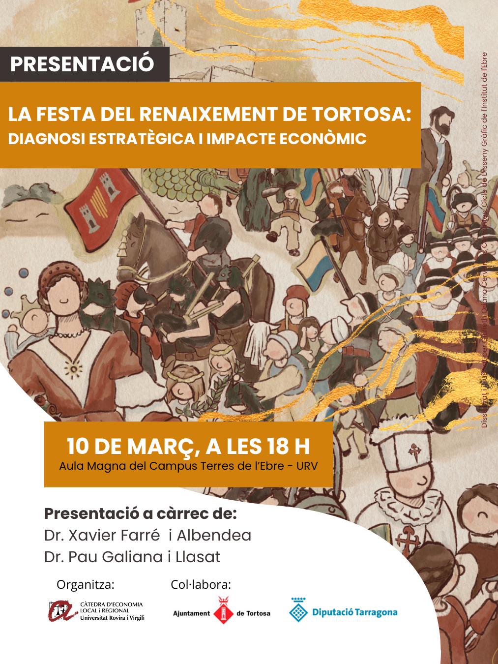 La Festa del Renaixement de Tortosa: diagnosi estratègica i impacte econòmic.L'anàlisi combina una diagnosi qualitativa a partir d'entrevistes a agents clau, amb un estudi quantitatiu basat en enquestes a assistents a peu de carrer. Es descriu el perfil dels visitants, la despesa realitzada, l'impacte econòmic generat i la valoració de l'esdeveniment. L'informe també aporta recomanacions estratègiques per orientar el futur de la Festa. Presentació a càrrec de: - Dr. Xavier Farré Albendea - Dr. Pau Galiana Llasat Podeu veure i descarregar l’informe des d’aquest enllaç |