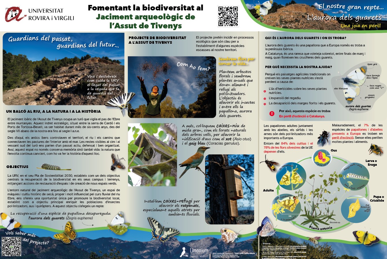 L'entorn natural del jaciment arqueològic de l'Assut de Tivenys, un espai de màquies i cultiu històric de secà veí i molt influenciat pel curs fluvial del riu Ebre, ens ofereix una oportunitat única per promoure la biodiversitat local, establint com a objectiu primer enriquir les poblacions d'insectes pol·linitzadors, aus i quiròpters. A aquest objectiu s'afegeix un repte: la recuperació d'una espècie de papallona desapareguda.