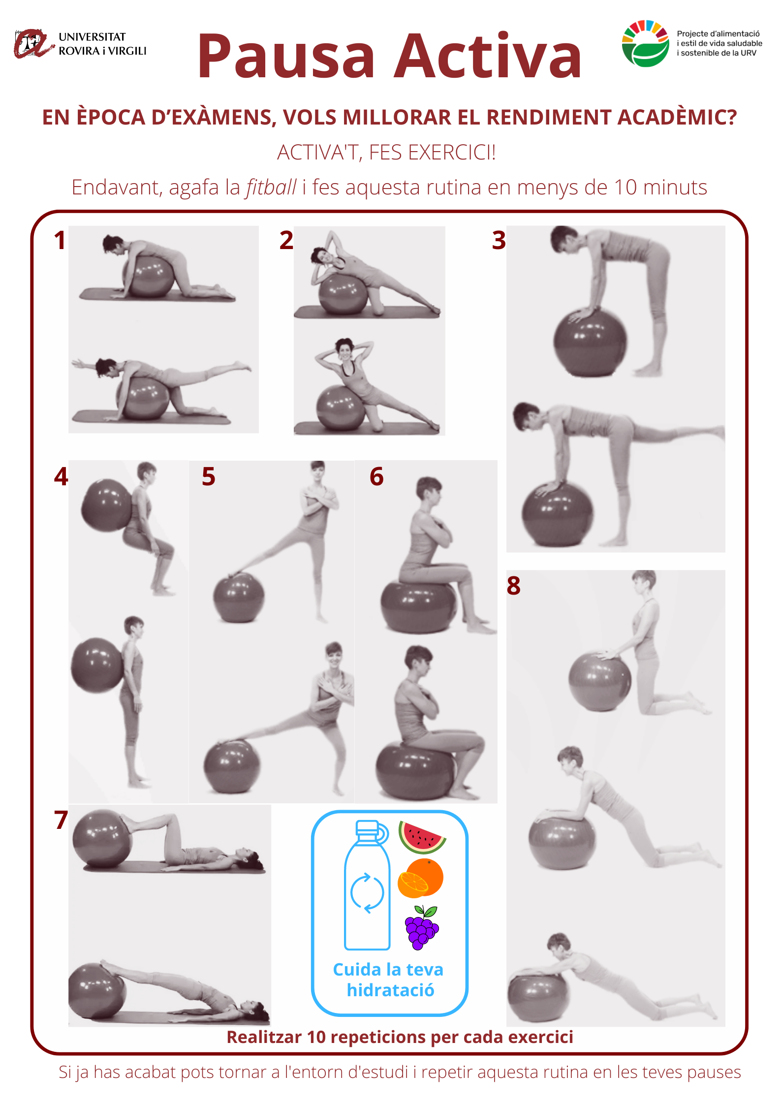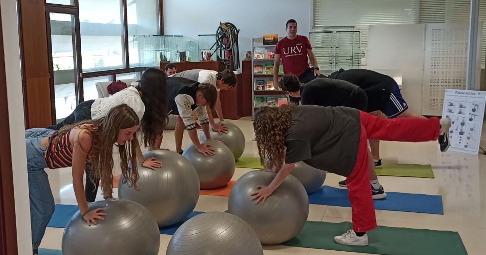 El pasado 8 de mayo de 2023 se impulsó al CRAI de Sescelades una actividad conjunta en la que se quería incentivar la buena hidratación como la importancia de las pausas activas durante el día a día, y todavía más importante durante la época de exámenes. Se propuso una serie de ejercicios con pelotas de yoga, dirigidos por el estudiante del grado de Fisioterapia Albert Almendros. Para facilitar a los alumnos que puedan realizar estos ejercicios se deja instalado al CRAI de Sescelades un espacio dedicado a la pausa activa.