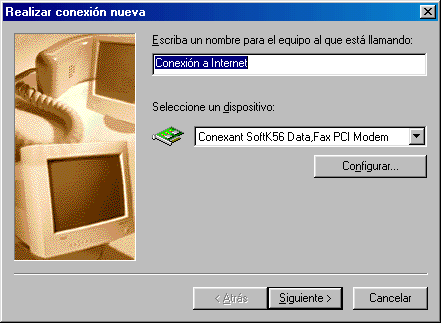 Escriba un nombre para la nueva conexión, por ejemplo Conexión a Internet y seleccione el modem que tenga instalado: