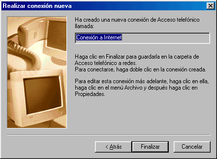 Pulsando siguiente accedemos a la ventana de finalización. Confirmamos pulsando la tecla de finalizar y ya hemos realizado una conexión nueva, denominada Conexión a Internet.