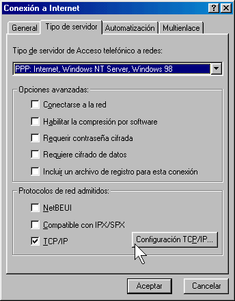 De todas las opciones disponibles, deje marcado sólo TCP/IP y pulse en Configuración TCP/IP..Seleccione en el desplegable el servidor PPP. Active sólo el Protocolo TCP/IP, pulsando con el botón izquierdo del botón esta casilla.