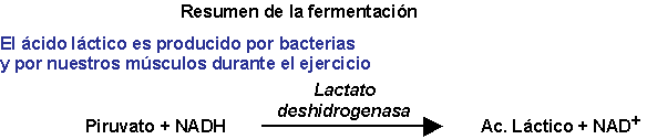 el ácido láctico en otros compuestos metabólicos. Fermentación y pH de la sangreEl ácido láctico se produce en nuestras células en ausencia de suficiente oxígeno, en un proceso llamado fermentación. Nuestros músculos en particular usan la transformación del piruvato en acido láctico para regenerar el NAD+ desde el NADH formado en la glicolisis, y asi poder continuar la producción de ATP por la glicolisis.La sobreproducción de ácido láctico simula un envenenamiento