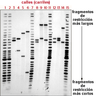 Las bandas que contienen fragmentos más largos de ADN están hacia la parte superior de la autorradiografía, mientras que las bandas que contienen fragmentos más cortos están hacia la parte inferior. En este punto es donde es importante el "Polimorfismo en la Longitud"; debido a que distintas personas tendrán diversas longitudes de ADN en la posición de un marcador RFLP, cada individuo tendrá bandas en lugares distintos de la autorradiografía. |