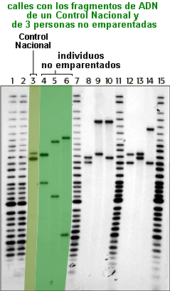 Los analistas de ADN tienen la precaución de usar siempre un control cuando hacen análisis de ADN. En la calle 3, Bob puso una muestra de ADN que siempre debe mostrar bandas en posiciones conocidas de la autorradiografía. Si tales bandas control no apareciesen donde el analista sabe que deben estar, a menudo se pone en duda la validez del resto de la información de la autorradiografía. En este caso, las bandas de control eran correctas. |