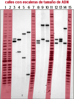 Cada autorradiografía tiene además varias calles con "escaleras de ADN". Cada banda de estas calles contiene un ADN de longitud conocida. Las "escaleras" se usan para determinar la longitud del ADN presente en las bandas de las otras calles. |