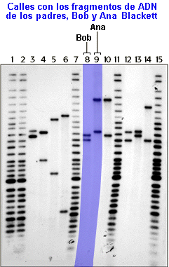 Observe también que, al igual que Alfredo y Nuria, Bob y Ana no comparten bandas en este locus de ADN. Aunque la banda superior de Bob está cerca de la banda inferior de Ana, no están tan próximas como para considerarse idénticas. |