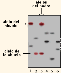 Alelos del padre Recuerda que tu madre y tu padre aportaron cada uno un juego de alelos a tu genoma. Por tanto, tu abuela y tu abuelo paternos aportaron cada uno un juego de alelos al genoma de tu padre. Observe, resaltados en rojo y en azul, que en efecto el abuelo y la abuela aportaron cada uno un alelo al padre. Sin embargo, es importante observar además los otros loci para asegurarse de que la coincidencia es correcta.