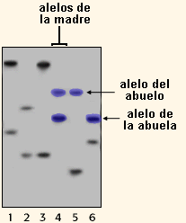 Alelos de la madre De nuevo se observa que tanto el abuelo como la abuela aportaron un alelo a la madre. Para asegurar que la respuesta es correcta, debes consultar las figuras de los 4 loci estudiados. Con esa información, podrás determinar si los abuelos de las autorradiografías de la familia Blackett son paternos o maternos.