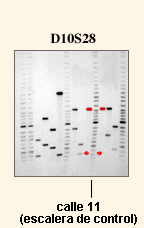 Preste atención al examinar los geles: observe que en el D10S28, las calles se curvan hacia la izquierda en la parte baja del gel. Hay muchas razones por las que un gel puede aparecer curvado; una de ellas es que al formar el gel el soporte no estuviera perfectamente horizontal.Compare las bandas utilizando la escalera control de la calle 11 como referencia para la distancia avanzada. Esta escalera de control debería ser de ayuda en la búsqueda de alelos compartidos.
