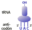 CodonesEl codón es una secuencia de tres bases sobre el mRNA, que determina un aminoácido. El anticodón es una secuencia del tRNA que es complementaria al codón. Para resolver el problema, primero escribe la secuencia antiparalela para el codón basándote en el anticodón del tRNA. En este ejemplo, el anticodón es 5'UAC. Así, el codón debe ser 3'AUG que es idéntico a 3'-AUG-5' (respuesta nº1).Problema 14 | Respuesta | Problema 15 El Proyecto Biologico > Biología Molecular > Ácidos nucleicos Department of Biochemistry and Molecular Biophysics University of Arizona Wednesday, October 9, 1996 Traducido: abril 2005 Contact the Development Team http://www.biology.arizona.edu