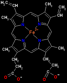 Cada subunidad de globina tiene unido un grupo hemo (una molécula de protoporfirina IX complejada con un ion Fe2+), responsable del color rojo de la hemoglobina y de la sangre.