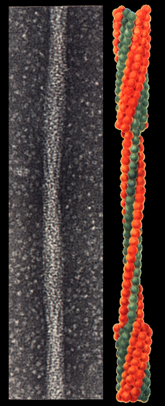 Imagem ao ME duma fibra produzida ao polimerizar um grande número de moléculas de hemoglobina S. (No esquema, cada esfera representa uma molécula de hemoglobina.)