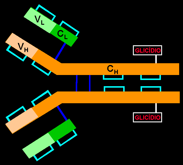 Como se observa nesta secção transversal do domínio CL, os esqueletos peptídicos das folhas beta formam duas lâminas que criam um "emparedado" contendo os resíduos hidrófobos da molécula. Os aa. com cadeias laterais polares e carregadas dispõem-se agora para a superfície, em contacto com o solvente. A ponte disulfeto fica introduzido no núcleo hidrófobo.