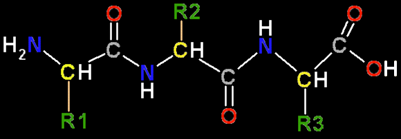 Dois aminoácidos podem se unir covalentemente através duma ligação amida substituída, nomeada ligação peptídica. Esta ligação se forma ao reagir o grupo alfa-carboxilo dum aminoácido com o grupo alfa-amino do outro aminoácido, perdendo-se uma molécula de água. Podem se unir três aminoácidos para formar um tripeptídeo: