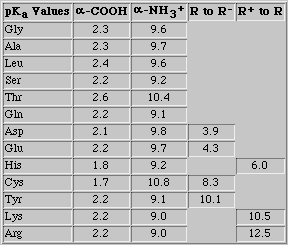 Los grupos ácido-base débiles presentan una capacidad tamponadora máxima en la zona próxima al pKa. La tabla de la derecha muestra los pKa de los 20 AA proteicos. Hay que destacar el hecho de que estos valores de pKa calculados para los AA en disolución pueden verse ligeramente modificados en el entorno proteico. Se observa que el único grupo lateral con un pKa próximo al pH fisiológico es la cadena lateral de la histidina. Por ello, las proteínas ricas en este AA se comportarán como excelentes amortiguadores fisiológicos.