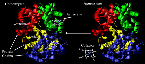 A veces, un enzima requiere para su función la presencia de sustancias no proteicas que colaboran en la catálisis: los cofactores. Los cofactores pueden ser iones inorgánicos como el Fe++, Mg++, Mn++, Zn++ etc. Casi un tercio de los enzimas conocidos requieren cofactores. Cuando el cofactor es una molécula orgánica se llama coenzima. Muchos de estos coenzimas se sintetizan a partir de vitaminas. En la figura inferior podemos observar una molécula de hemoglobina (proteína que transporta oxígeno) y su coenzima (el grupo hemo). Cuando los cofactores y las coenzimas se encuentran unidos covalentemente al enzima se llaman grupos prostéticos. La forma catalíticamente activa del enzima, es decir, el enzima unida a su grupo prostético, se llama holoenzima. La parte proteica de un holoenzima (inactiva) se llama apoenzima, de forma que: