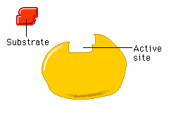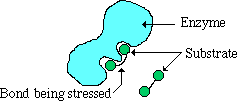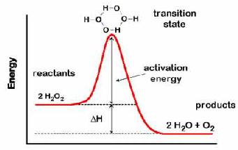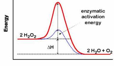 La acción de los catalizadores consiste, precisamente, en disminuir la Ea (Figura superior derecha). Los enzimas son catalizadores especialmente eficaces, ya que disminuyen la Ea aún más que los catalizadores inorgánicos. Por ejemplo, la descomposición del agua oxigenada (H2O2) para dar H2O y O2 puede ocurrir sin catalizador, con un catalizador inorgánico (platino), o con un enzima específico (catalasa). Las respectivas Ea para cada proceso son 18, 12 y 6 Kcal/mol. Así, se puede calcular que el platino acelera la reacción 20.000 veces, mientras que la catalasa la acelera 370.000 veces. Para que una reacción química tenga lugar, las moléculas de los reactantes deben chocar con una energía y una orientación adecuadas. La actuación del enzima (1) permite que los reactantes (sustratos) se unan a su centro activo con una orientación óptima para que la reacción se produzca y (2) modifica las propiedades químicas del sustrato unido a su centro activo, debilitando los enlaces existentes y facilitando la formación de otros nuevos (Figuras inferiores):