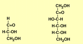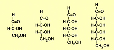Los monosacáridos simples son aldehídos o cetonas polihidroxilados. Los monosacáridos con función aldehído se llaman aldosas (a la izquierda en la figura) y los monosacáridos con función cetona se llaman cetosas (a la derecha en la figura). Según la longitud de la cadena carbonada se distingue entre aldo- y cetotriosas, aldo- y cetotetrosas, aldo- y cetopentosas: