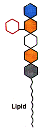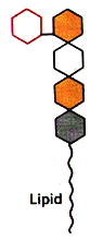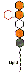 Los oligosacáridos se unen a los lípidos mediante un enlace O-glicosídico a un grupo OH del lípido. La Figura de la derecha muestra un oligosacárido unido a un fosfolípido. La unión y la estructura del oligosacárido son de tal manera que éste no presenta ningún grupo reductor libre. En la composición del oligosacárido suelen formar parte monosacáridos como: D-glucosa, D-galactosa, D-manosa, N-acetil-D-glucosamina, N-acetil-D-galactosamina, ácido siálico y fucosa. |