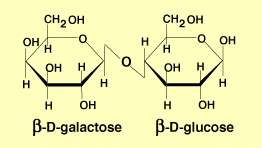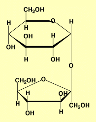 La celobiosa no existe como tal en la Naturaleza y se obtiene a partir de la hidrólisis de la celulosa, un polisacárido que forma parte de la pared celular en las plantas superiores. Está formada por dos glucosas unidas por el OH del C1 en posición b de una y el OH del C4 de otra. Su nombre sistemático es 4-O-(b-D-glucopiranosil)-D-glucopiranosa, o abreviado, G(1b®4)G. La lactosa está formada por glucosa y galactosa. El OH del C1 en posición b de la galactosa está unido al OH del C4 de la glucosa. Su nombre sistemático es 4-O-(b-D-galactopiranosil)-D-glucopiranosa, o abreviado, Ga(1b®4)G. Este azúcar se encuentra como tal en la leche.