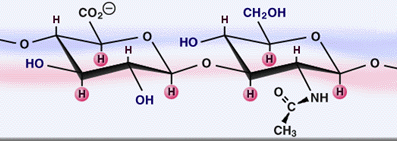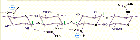 | Está formado por ácido glucurónico y N-acetilglucosamina. Es el glicosaminoglicano de mayor peso molecular (hasta 2 X 107 dalton). Se encuentra en abundancia en el humor vítreo del ojo, en el líquido sinovial de las articulaciones y en la matriz extracelular de los tejidos de origen mesodérmico. No está sulfatado, y no está unido a proteínas. | ![]() |