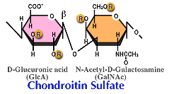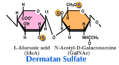 ![]() También llamado dermatán sulfato. Está formado por ácido L-idurónico y N-acetilgalactosamina 6-sulfato. Está presente en la piel, los vasos sanguíneos y válvulas del corazón. |