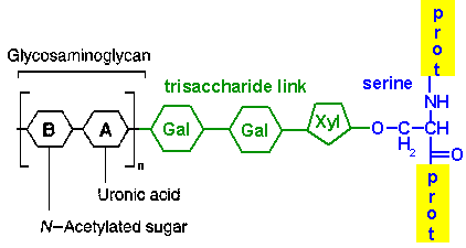 Su estructura química es muy variada, pero reúnen algunas características comunes que conviene destacar: 1.- En casi todos, la unidad repetitiva básica es un disacárido, formado por un ácido urónico (D-glucurónico o L-idurónico) unido por un enlace (1b®3) a un aminoazúcar (N-acetilglucosamina o N-acetilgalacatosamina). Este disacárido se une al siguiente por un enlace (1b®4). Son, por tanto, cadenas lineales donde alternan enlaces (1b®3) con enlaces (1b®4). 2.- Los residuos monosacáridos presentan grados variables de sulfatación. El sulfato esterificado a los OH alcohólicos aumenta el carácter polianiónico de estos polisacáridos. 3.- Con la excepción del ácido hialurónico, se presentan unidos covalentemente a proteínas, formando los proteoglicanos (también llamados mucopolisacáridos). No hay que confundir proteoglicano con glicoproteína. En los primeros, el componente glicídico es superior al 90%, mientras que en las segundas oscila entre el 5 y el 70%. La unión a la proteína es normalmente del tipo O-glicosídico, y en ella interviene un trisacárido formado por dos galactosas y una xilosa (Ver figura inferior). Sólo en el caso del queratan sulfato, la unión es del tipo N-glicosídico.