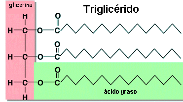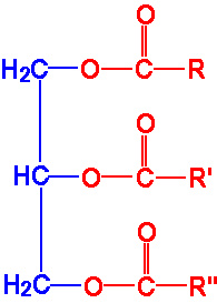 | Los ácidos grasos más frecuentes en los acilgliceroles son palmítico y esteárico (entre los saturados); y oleico y linoleico (entre los insaturados). Con bastante frecuencia, la posición sn-2 de los triacilgliceroles está ocupada por un ácido graso insaturado. Los triglicéridos animales poseen mayor porcentaje de ácidos grasos saturados, por lo que suelen ser sólidos a temperatura ambiente (grasas). Los triglicéridos vegetales y de los animales marinos tienen un alto contenido de ácidos grasos insaturados, y son líquidos a temperatura ambiente (aceites). |