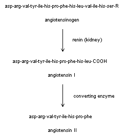 El agente hipertensor más potente que se conoce es la angiotensina II, un octapéptido que se origina mediante la hidrólisis de una proteína precursora que se llama angiotensinógeno, y que no tiene actividad vasopresora. Otros péptidos son agentes hipotensores (tienen actividad vasodilatadora). Uno de los mejor conocidos es la bradiquinina, un nonapéptido que se origina mediante la hidrólisis de una proteína precursora que se llama quininógeno. En la figura inferior se omiten los dobles enlaces de la bradiquinina.