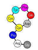 Las hormonas son señales químicas que ejercen su acción sobre órganos y tejidos situados lejos del lugar donde se han sintetizado. Muchas hormonas tienen estructura peptídica, como por ejemplo la oxitocina (nonapéptido que provoca la contracción uterina y la secreción de leche por la glándula mamaria), la vasopresina (nonapéptido que induce la reabsorción de agua en el riñón), la somatostatina (tetradecapéptido que inhibe la liberación de la hormona del crecimiento). La insulina y el glucagón son proteínas producidas por el páncreas y que regulan el metabolismo de los azúcares. En la Figura inferior se observa cómo la insulina está formada por dos cadenas polipeptídicas unidas entre sí mediante tres puentes disulfuro (en amarillo). En la representación de la oxitocina no aparecen los átomos de hidrógeno ni los dobles enlaces.