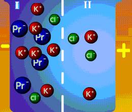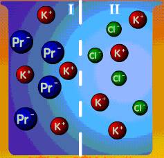 Por otro lado, las proteínas se comportan como polianiones, cuyas cargas están neutralizadas por iones Na+ o K+ (Figura inferior izquierda). Las membranas biológicas son permeables a estos iones y a sus contraiones, con lo cual su concentración a ambos lados de la membrana se equilibra. Sin embargo, la existencia de proteínas en sólo uno de los compartimentos provoca la retención permanente de iones difusibles en ese lado de la membrana (efecto Donnan), lo que incrementa el efecto osmótico (Figura inferior derecha).