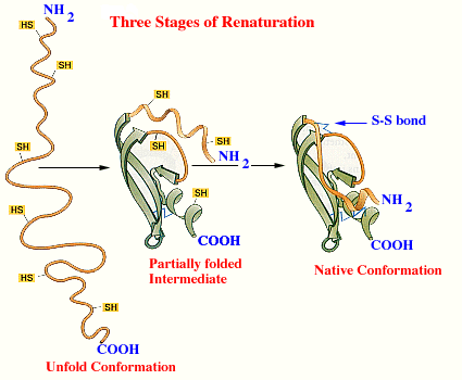 Cuando la proteína no ha sufrido ningún cambio en su interacción con el disolvente, se dice que presenta una estructura nativa. Cualquier alteración de la estructura nativa que modifique su interacción con el disolvente y que provoque su precipitación dará lugar a una estructura desnaturalizada. En una proteína cualquiera, la estructura nativa y la desnaturalizada tan sólo tienen en común la estructura primaria, es decir, la secuencia de AA que la componen. Los demás niveles de organización estructural desaparecen en la estructura desnaturalizada. La desnaturalización provoca diversos efectos en la proteína:
