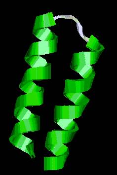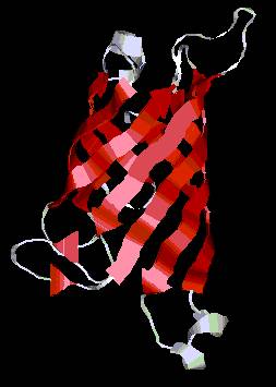 Este es un motivo estructural poco frecuente, que aparece en la proteína UDP N-Acetilglucosamina O-Aciltransferasa de E. coli. Se puede apreciar una hélice levógira formada por el enrollamiento de varias estructuras b orientadas de forma paralela. En el interior de la b-hélice se acumulan las cadenas laterales hidrofóbicas, lo que da estabilidad a la estructura. |