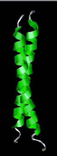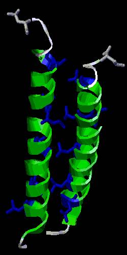 A menudo, estas dos hélices interaccionan entre sí mediante cadenas laterales de leucina (Figura de la derecha, en color azul), originando una estructura llamada "cremallera de leucina" que aparece con frecuencia en proteínas que interaccionan con el DNA. |