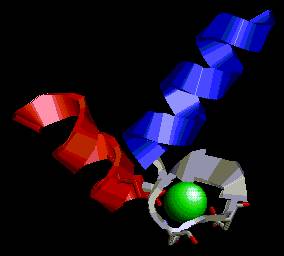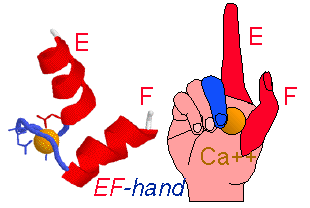 Formada por dos a-hélices conectadas entre sí por un giro. Está presente en proteínas que se unen a calcio como la calmodulina o la troponina-C. La unión al Ca++(átomo de color verde en la Figura inferior izquierda y de color naranja en la Figura inferior derecha) se lleva a cabo gracias a las tres cadenas laterales de Asp localizadas en la secuencia que conecta las dos hélices (en color claro en la Figura inferior izquierda y en color azul en la Figura inferior derecha).