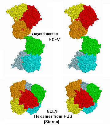 Another example is 5cev (arginase). The specific oligomer is a hexamer, but file 5cev contains two half-hexamers with a crystal contact interface between them.