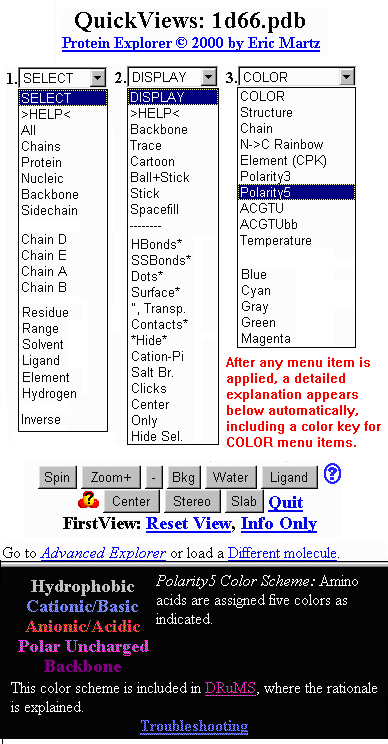 QuickViews is a simple, menu-driven exploration interface for novices, within Protein Explorer. Typically, you SELECT some portion of the molecule, then DISPLAY it as you wish, then apply the desired COLOR scheme.