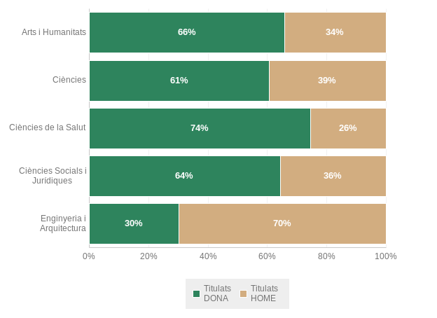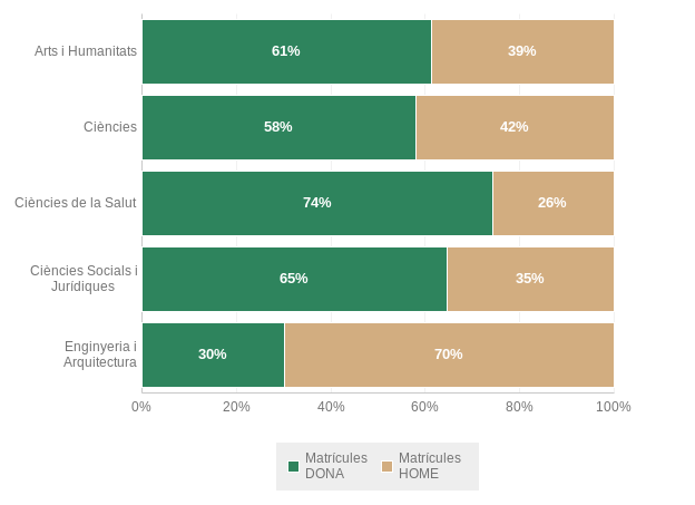 Percentatge d'estudiants per branca de coneixement i gènere. Curs 2024-25