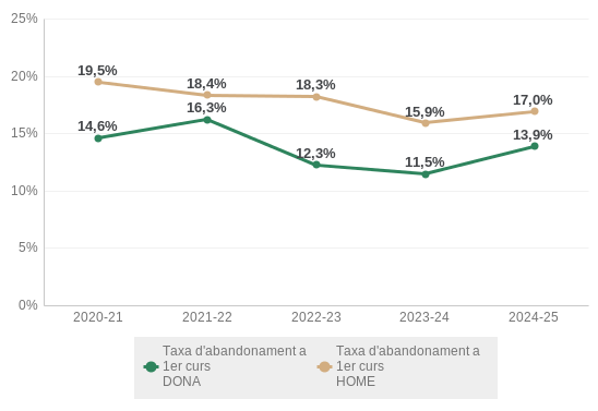 Evolució de la taxa d'abandonament a 1er curs de grau per gènere