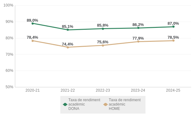 Evolució de la taxa de rendiment acadèmic de grau per gènere