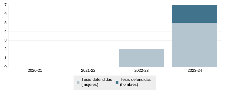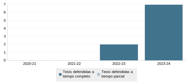 Curso académico | Tesis defendidas | % Menciones internacionales | Resultados científicos de las tesis (3) | Duración media a tiempo completo (en años) | Duración media a tiempo parcial (en años) | % Abandono | % Estancias de investigación (3) |